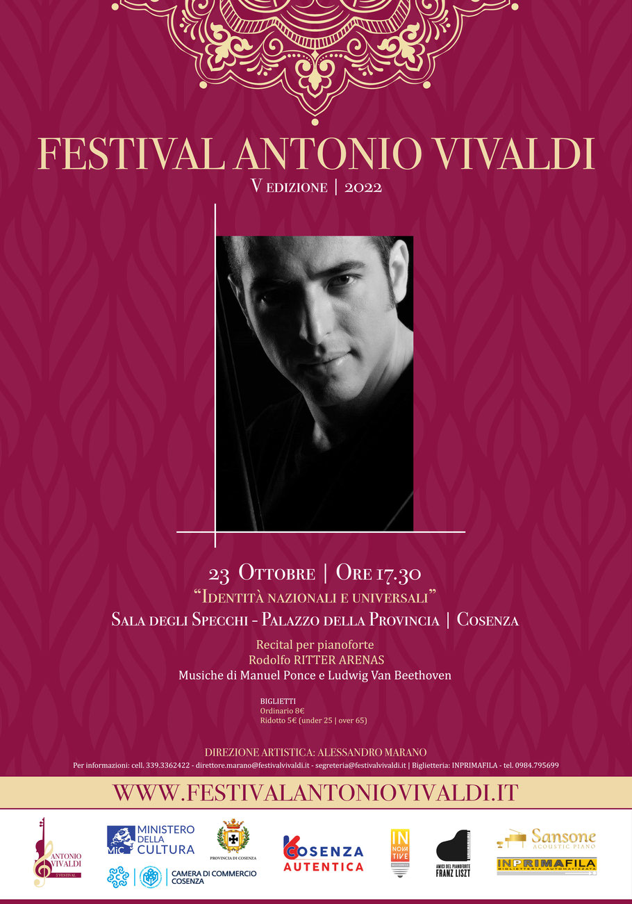 Rodolfo Ritter Arenas - Nato a Città del Messico. Ha fatto le sue prime incursioni nel mondo della musica per pianoforte sotto la guida di Gustavo Morales e Andrés Oseguera. Ha studiato pianoforte presso la Scuola Superiore di Musica INBA con l'insegnante Ileana Bautista. Ha inoltre studiato a Vienna, Weimar e Israele con pianisti della levatura di Jorge Luis Prats, György Sándor, Ferenc Rados, Viktor Derevianko, Rudolf Kehrer, Valery Afanassiev e Pierre-Laurent Aimard. Ha ottenuto la Medaglia d'Oro al IV Concorso Pianistico Nazionale Angélica Morales 2003 e nello stesso anno ha debuttato al Palacio de Bellas Artes come solista dell'Orchestra Sinfonica Nazionale. La sua carriera di successo lo ha portato ad apparire in forum come la Sala Nezahualcóyotl e il Palazzo delle Belle Arti in Messico, il Salon d'Honneur de Les Invalides a Parigi, il Palazzo Altenburg in Germania, il Konserthuset a Copenaghen, la Sala Tripcovich a Trieste e il Castello Ginori in Italia. Ha tenuto concerti in Austria, Spagna, Svizzera, Italia, Francia, Israele, Ecuador e Cuba e si è esibito come solista nelle principali orchestre del Messico, sotto la direzione di direttori quali Enrique Diemecke, Jesús Medina, Ramón Shade, Enrique Barrios, José Miramontes Zapata, Juan Carlos Lomónaco, Román Revueltas e José Luis Castillo, tra gli altri. Il Maestro Ritter ha eseguito in prima assoluta in Messico e in America Latina il Concerto per pianoforte n. 1 del compositore tedesco Franz Xaver Scharwenka, nonché La luna y la muerte, del compositore spagnolo Miguel Gálvez-Taroncher. È stato anche il primo pianista messicano a presentare i cicli completi di concerti per pianoforte e orchestra di Béla Bartók e Sergei Rachmaninoff, con le orchestre Sinfónica Nacional, de Minería, OFUNAM, Filarmonica di Città del Messico, Sinfonia dello Stato del Messico e Sinfonia di San Luis Potosí. Oltre a svolgere un'intensa attività come solista e arrangiatore, Rodolfo Ritter si è cimentato nella composizione e nella direzione d'orchestra. Attualmente è membro dei Concertisti di Belle Arti, fa parte della giuria in vari concorsi pianistici e svolge un prezioso lavoro di diffusione della musica attraverso il suo programma radiofonico su Internet La vida secreta. I suoi album includono Primero piano, le due puntate della sua Antologia di musica messicana per pianoforte e orchestra e Rosa Mexicano, quest'ultimo un album in cui si avventura nella musica tradizionale del nostro paese insieme alla cantante Regina Orozco.