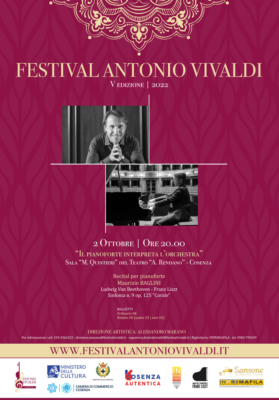 Maurizio Baglini - Pianista visionario, con il gusto per le sfide musicali, Maurizio Baglini ha un’intensa carriera concertistica internazionale. Vincitore a 24 anni del “World Music Piano Master” di Montecarlo, si esibisce regolarmente all’Accademia Nazionale di Santa Cecilia, al Teatro alla Scala di Milano, al Teatro San Carlo di Napoli, alla Salle Gaveau di Parigi, al Kennedy Center di Washington ed è ospite di prestigiosi festival, tra cui La Roque d’Anthéron, Yokohama Piano Festival, Australian Chamber Music Festival, “Festival Pianistico Internazionale di Bergamo e Brescia. Ha suonato come solista con importanti compagini tra cui l’Orchestra Sinfonica Nazionale della Rai, la Gustav Mahler Jugendorchester, l’Orchestre Philharmonique de Monaco, la New Japan Philharmonic Orchestra, l’Orchestra del Maggio Musicale Fiorentino, e con direttori quali Luciano Acocella, Francesco Angelico, Marco Angius, John Axelrod, Antonello Allemandi, Umberto Benedetti Michelangeli, Giampaolo Bisanti, Filippo Maria Bressan, Marcello Bufalini, Massimiliano Caldi, Tito Ceccherini, Daniel Cohen, Howard Griffiths, Armin Jordan, Seikyo Kim, Emanuel Krivine, Antonello Manacorda, Karl Martin, Donato Renzetti, Corrado Rovaris, Ola Rudner, Daniele Rustioni e Maximiano Valdes, Tobias Woegerer. È il solista dedicatario di Tre Quadri, Concerto per pianoforte e orchestra di Francesco Filidei, che ha eseguito in prima assoluta con l’OSN Rai diretta da Tito Ceccherini in streaming su Rai Cultura, Rai Radio 3, EuroRadio e in onda su Rai5 a novembre 2020. Nel Settembre 2021, Tre Quadri é stato eseguito da Baglini e Ceccherini, ancora una volta con l'OSN Rai, in prima esecuzione mondiale con pubblico, al Teatro alla Scala di Milano, per il Festival Milano Musica. Accolta da ottime recensioni, la sua produzione discografica per Decca/Universal comprende musiche per tastiera di Liszt, Brahms, Schubert, Domenico Scarlatti e Mussorgsky e la collana Live at Amiata Piano Festival. Baglini sta inoltre realizzando l’integrale pianistica di Schumann e i primi 5 cd sinora disponibili sono già considerati un punto di riferimento interpretativo. È tra i pochi virtuosi al mondo a eseguire la “Nona Sinfonia” di Beethoven nella trascendentale trascrizione pianistica di Liszt. Dal 2008 a oggi è stato invitato a cimentarsi dal vivo in questo vertiginoso capolavoro su molti prestigiosi palcoscenici – in città tra cui Roma, Milano, Cremona, Parigi, Monaco, Tel Aviv, Beirut, Rio de Janeiro – e nel 2020 ha superato la cifra record di cento esecuzioni. Ha dato vita all’innovativo progetto “Web Piano” nel quale le sue interpretazioni dal vivo – dal Carnaval di Schumann ai Quadri di un’esposizione di Mussorgsky o Images di Debussy – sono accompagnate dalle videoproiezioni dell’artista Giuseppe Andrea L’Abbate (La Roque d’Anthéron, Lisztomanias, Châteauroux, Emilia Romagna Festival). Appassionato anche del repertorio cameristico, ha condiviso il palco con Kristóf Baráti, Enrico Bronzi, Gautier Capuçon, Renaud Capuçon, Cinzia Forte, Corrado Giuffredi, Andrea Griminelli, Gabriele Pieranunzi, Roberto Prosseda, Massimo Quarta, il Quartetto della Scala e altri illustri colleghi. Dal 2006 forma un duo stabile con la violoncellista Silvia Chiesa, con la quale ha all'attivo oltre 250 concerti in tutto il mondo. È il direttore artistico dell’Amiata Piano Festival, la rassegna musicale internazionale che ha fondato nel 2005 e che dal 2015 si svolge al Forum Bertarelli di Poggi del Sasso (Grosseto, Toscana). Dal 2013 è consulente artistico per la musica e la danza del Teatro Comunale “Verdi” di Pordenone che in questi anni ha realizzato concerti esclusivi per l’Italia, ha dato vita a una collana editoriale in collaborazione con Ets ed è diventato il principale partner della Gustav Mahler Jugendorchester nei suoi tour europei. Nel 2019 è stato nominato Socio Onorario dell’Aiarp, l’Associazione Italiana Accordatori e Riparatori di Pianoforti «per gli alti meriti e gli importanti contributi artistici che la sua attività ha portato alla causa del pianoforte». Suona un grancoda Fazioli.