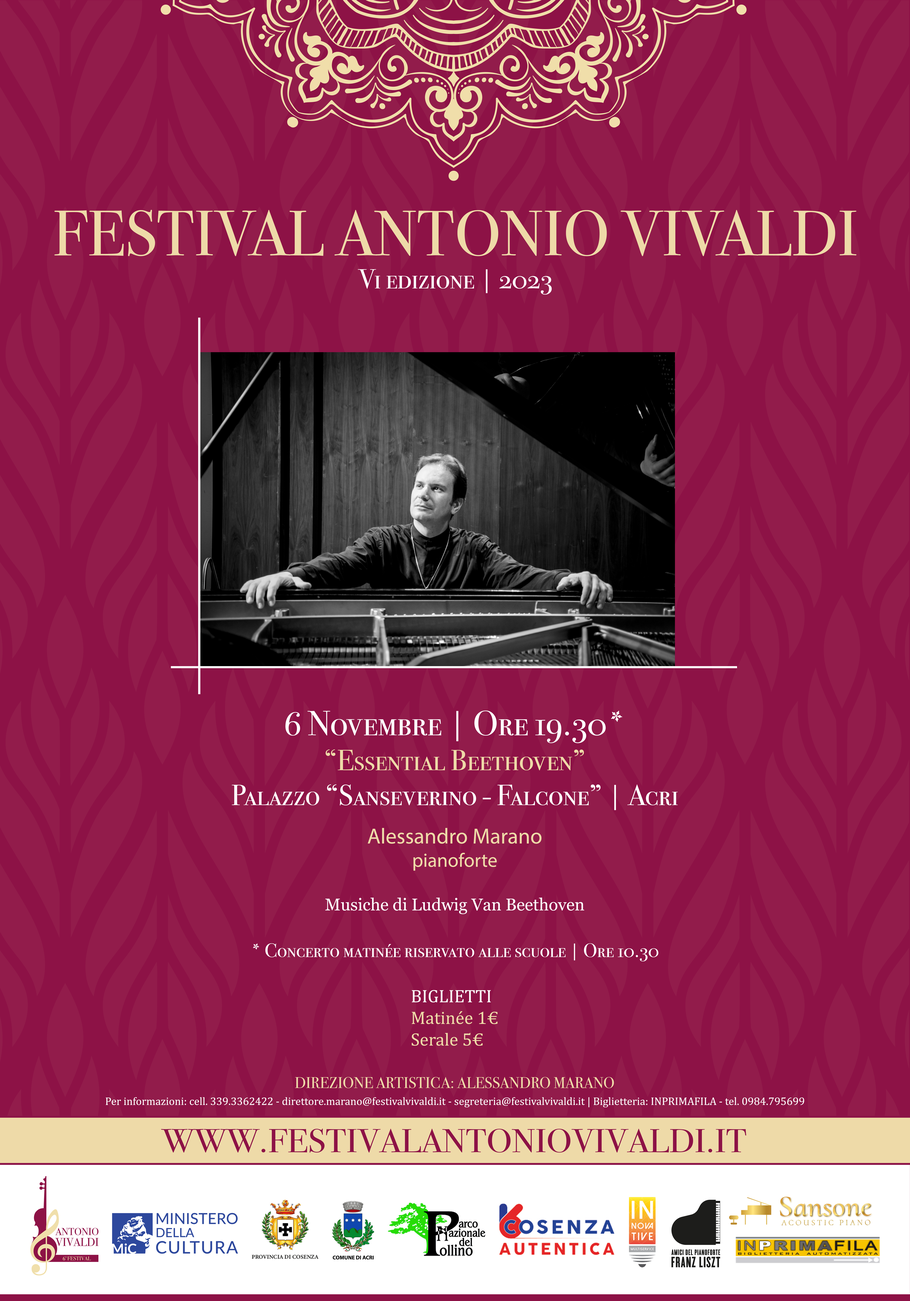 Alessandro Marano, brillante pianista cosentino della sua generazione, si forma sotto la guida del Maestro Giuseppe Maiorca presso il Conservatorio di Musica “S. Giacomantonio” di Cosenza e parallelamente frequenta i Corsi Internazionali di alto perfezionamento pianistico presso la Foundation “Paul Hindemith” di Blonay in Svizzera seguendo le lezioni di illustri maestri e concertisti di fama internazionale fra i quali Edith Fischer e Paul Badura-Skoda. Completano la sua formazione pianistica e musicale i Maestri Aldo Ciccolini e Bruno Canino. Ha ottenuto premi, menzioni speciali, borse di studio e riconoscimenti in più di cinquanta concorsi pianistici nazionali ed internazionali; svolge una intensa attività concertistica suonando in veste di solista in tutt'Italia e all’estero (Svizzera, Spagna, Ungheria, Romania, Bulgaria, Austria, Francia, Repubblica Ceca, Russia, Grecia, Gran Bretagna, Polonia, Repubblica di Moldavia), riscuotendo ovunque calorosi apprezzamenti da parte del pubblico e della critica. Solista apprezzato per la serietà e la profondità delle sue interpretazioni, si dedica alla ricerca, allo studio e all'esecuzione delle composizioni di Franz Liszt (il Maestro esegue l’integrale dei 12 Studi Trascendentali, le Armonie poetiche e religiose, le composizioni per pianoforte e orchestra e le parafrasi da opere di Verdi e di Wagner), con particolare riguardo a quelle meno frequentate. Fra il 2015 e il 2016, ha portato a termine l’integrale dei concerti per pianoforte e orchestra di Beethoven riscoprendo le trascrizioni per organico d’archi del musicista tedesco Vinzenz Lachner, eseguendoli anche in tre serate e senza Direttore all’interno della stagione concertistica 2017 della Società dei Concerti di Ravello. Ha suonato in veste di solista con importanti orchestre: Filarmonica “Mihail Jora” Bacau, Arad State Filarmonic, Filarmonica Botosani, Romania; Pazardzhik Symphony Orchestra, Bulgaria;