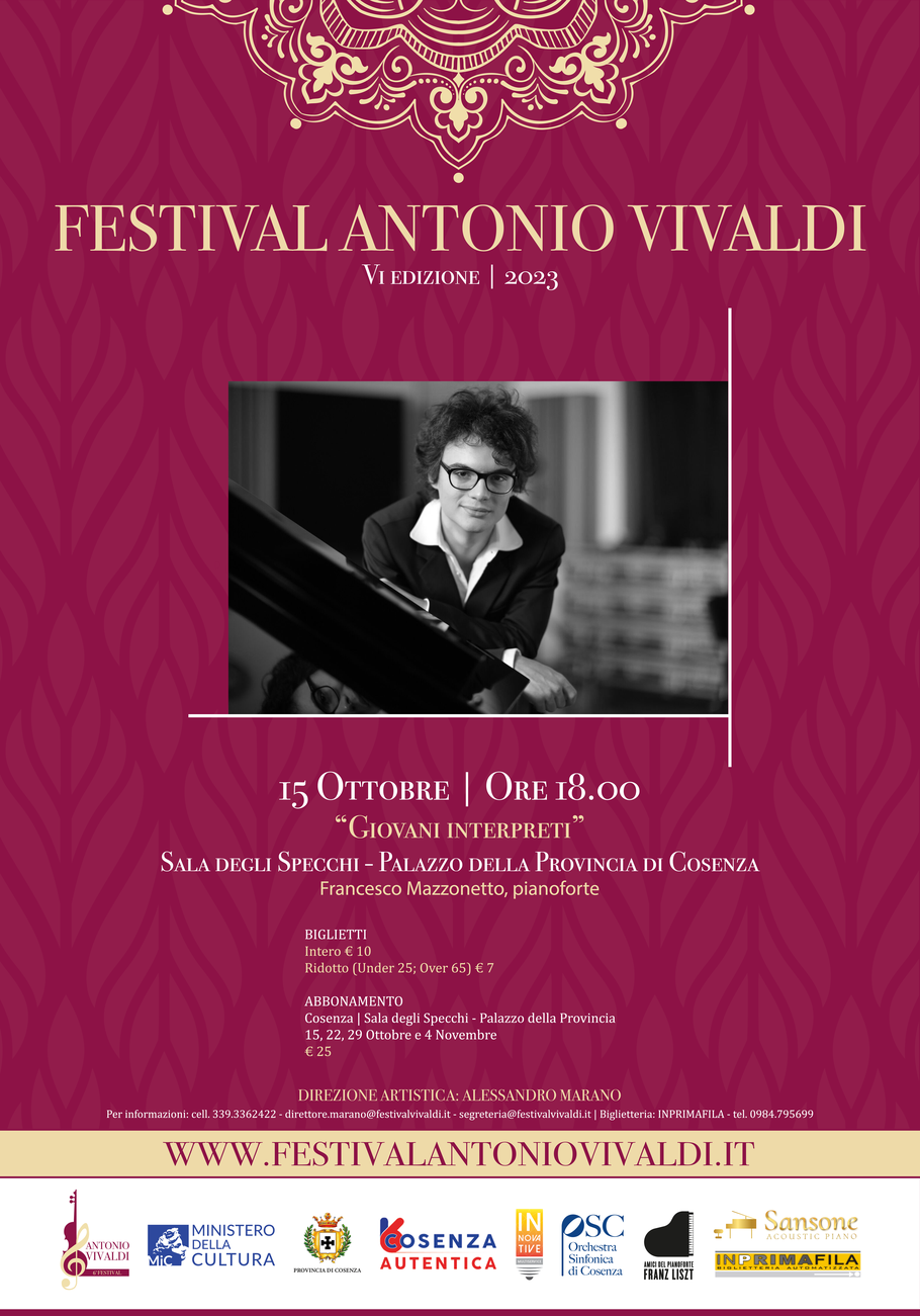 Francesco Mazzonetto è nato nell'agosto del 1997 a Torino. Si laurea in pianoforte nell’Anno Accademico 2019/2020 con il massimo dei voti e la lode all’ISSM “O. Vecchi – A.Tonelli” di Modena sotto la guida del M° Marco Sollini, dopo aver già conseguito brillantemente il Diploma sotto la guida del M° Alessio Cioni. In duo con il violinista Leonardo Ricci si è perfezionato in musica da camera con il M° Pier Narciso Masi presso il Centro Studi Musica e Arte di Firenze. Dal 2022 è Direttore Artistico del “Musica Regina in Villa” International Music Festival, Festival Musicale ospitato nella Villa della Regina a Torino, per la valorizzazione del patrimonio culturale e dei giovani attraverso la musica. Durante i suoi studi frequenta numerose Masterclasses Internazionali di alto perfezionamento pianistico dei Maestri: Muriel Chemin, Alessio Cioni, Bruno Canino, Luca Rasca, Pavel Gililov, Simon Bottomley alla Chetam's Music School di Manchester. Frequenta la Master Class di musica Rossiniana del M° Marco Sollini. Si è perfezionato con i Maestri: Riccardo Risaliti e Boris Petrushansky ai Corsi di alto perfezionamento dell'Accademia Pianistica Internazionale di Imola "Incontri con il Maestro". Viene selezionato nella Masterclass del M°Jefferey Swann. E’ stato inoltre selezionato per la Masterclass di Alto Perfezionamento tenuta dal M°Lilya Zilberstein presso Accademia Musicale Internazionale Chigiana. Viene selezionato con borsa di studio e cinque concerti, unico italiano, dal M° Gintaras Janusevicius alla Feuerwerk International Piano Academy; nel 2022 viene selezionato per partecipare alla Masterclass di alto perfezionamento pianistico tenuto dal maestro Gianluca Luisi presso l’XI International summer Piano Academy a Disentis in Svizzera Ha vinto numerosi Concorsi Pianistici Nazionali ed Internazionali, ricordiamone alcuni: 1° Premio Assoluto Concours Musical de France a Parigi. 1° Premio Assoluto alla IV edizione sezione giovani del Concorso Pianistico Internazionale città di Osimo. 1° Premio Concorso Pianistico Internazionale "Lazar Berman". Vincitore Assoluto del III° Concorso Internazionale "Pietro Montani". Si esibisce con regolarità in numerose sale da concerto in Italia e all'estero, sempre con lusinghieri consensi di pubblico e critica: Auditorium Giovanni Agnelli del Lingotto di Torino, Teatro La Nuova Fenice di Osimo, Palazzina di caccia di Stupinigi per la rassegna “Palchi Reali” dove duetta con Sasha Boldachev prima arpa del Teatro Bolshoi di Mosca, Fondazione Accademia Chigiana, Museo Nazionale Palazzo Spinola per la Fondazione del Teatro Carlo Felice di Genova, Milano Piano City, Auditorium Tacchi - Morris Taunton UK, International Debussy Festival Dieppe - Varengeville Francia. Particolarmente applaudito il suo concerto di capodanno 2018 alla Galleria Umberto 1° a Torino con la collaborazione della Fondazione Cultura. Suona per la stagione 2018/2019 di Villa Bertelli a Forte dei Marmi, nella stagione 2019 dell’ Università popolare di Milano e a marzo 2019 è solista con l’Orchestra Sinfonica diretta dal M° Fabrizio Ventura nel Concerto n. 3 di Beethoven nella sala Bozzi del Conservatorio di Bologna. Suona in Germania per l’Istituto Italiano di Cultura di Amburgo e per la Stagione Musicale 2019 “Musikalische Shatze im Schloss” nella Gartensaal città di Wolfsburg. Viene invitato a suonare al “International Music Festival” a St. Jhon’s In The Village con il patrocinio dell’Istituto Italiano di Cultura a New York. Sempre a New York suona il 3° Concerto di Beethoven per 2 pianoforti con il M°Jeffrey Swann alla Steinway Hall. Debutta a Parigi nella prestigiosa Sala da Concerto dell’Istituto Italiano di Cultura. Gli viene assegnato il prestigioso premio “Università popolare di Milano 2019” e apre l’anno Accademico 2019/20 con il suo Concerto. Nel 2020 tiene un meraviglioso concerto alla prestigiosa Norrlands Operan di Umeå in Svezia, dove viene richiamato a suonare nella primavera 2022. Suona per la sedicesima edizione del Festival Internazionale “Armonie della Sera”. Invitato dal M° Uto Ughi si esibisce nell’ambito del quarto “Festival Internazionale Green Music” in collaborazione con il “Festival delle Corrispondenze”. Tiene un doppio concerto per l’Unione Musicale di Torino nella stagione 2020/2021 al Teatro Vittoria di Torino, a ottobre 2020 viene chiamato dal Festival Recondite Armonie a tenere un concerto in qualità di ospite al Teatro degli Industri di Grosseto. Nel 2021 tiene un concerto per gli studenti dell’ Academy della Scuola Holden di Torino, su invito del Maestro Nicola Campogrande, Direttore Artistico di MiTo Settembre Musica. Nell’agosto 2022 si esibisce all’interno del Festival PianoLab di Martina Franca in Puglia, nello stesso mese su invito del Maestro Mariusz Smolij, Direttore Musicale dell’Acadiana Symphony Orchestra, si esibisce presso l’Acadaina Center for Arts di Lafayette in Louisiana, in un doppio recital solistico e in formazione di quintetto con membri dell’orchestra. Conclude agosto con un concerto presso la Villa Scacciapensieri di Siena, all’interno del Festival Soirées fantasques. A gennaio 2023 si esibisce per Promusica Aguilas con gran successo di pubblico all’ Auditorio y Palacio de Congresos “Infanta Dona Elena” ad Aguilas in Spagna. Tiene un concerto per la Fondazione Cerruti che ospita una delle collezioni private di quadri più grande e importante al mondo. All'età di 15 anni ha eseguito il Concerto K 466 di Mozart con l'Orchestra Sinfonica al Teatro Piccolo Regio Puccini di Torino (“il pianoforte di un virtuoso sedicenne” La Stampa 24/10/2013). Nel 2015 ha eseguito il Concerto per pianoforte di Haydn in Re maggiore con l'Orchestra da Camera Fiorentina ospite della Stagione Concerti di Toscana Classica presso l'Auditorium Orsanmichele di Firenze. Ha collaborato come solista con i Maestri Ivan Velicanov, Joost Smeets, Lucie Leguay ne
