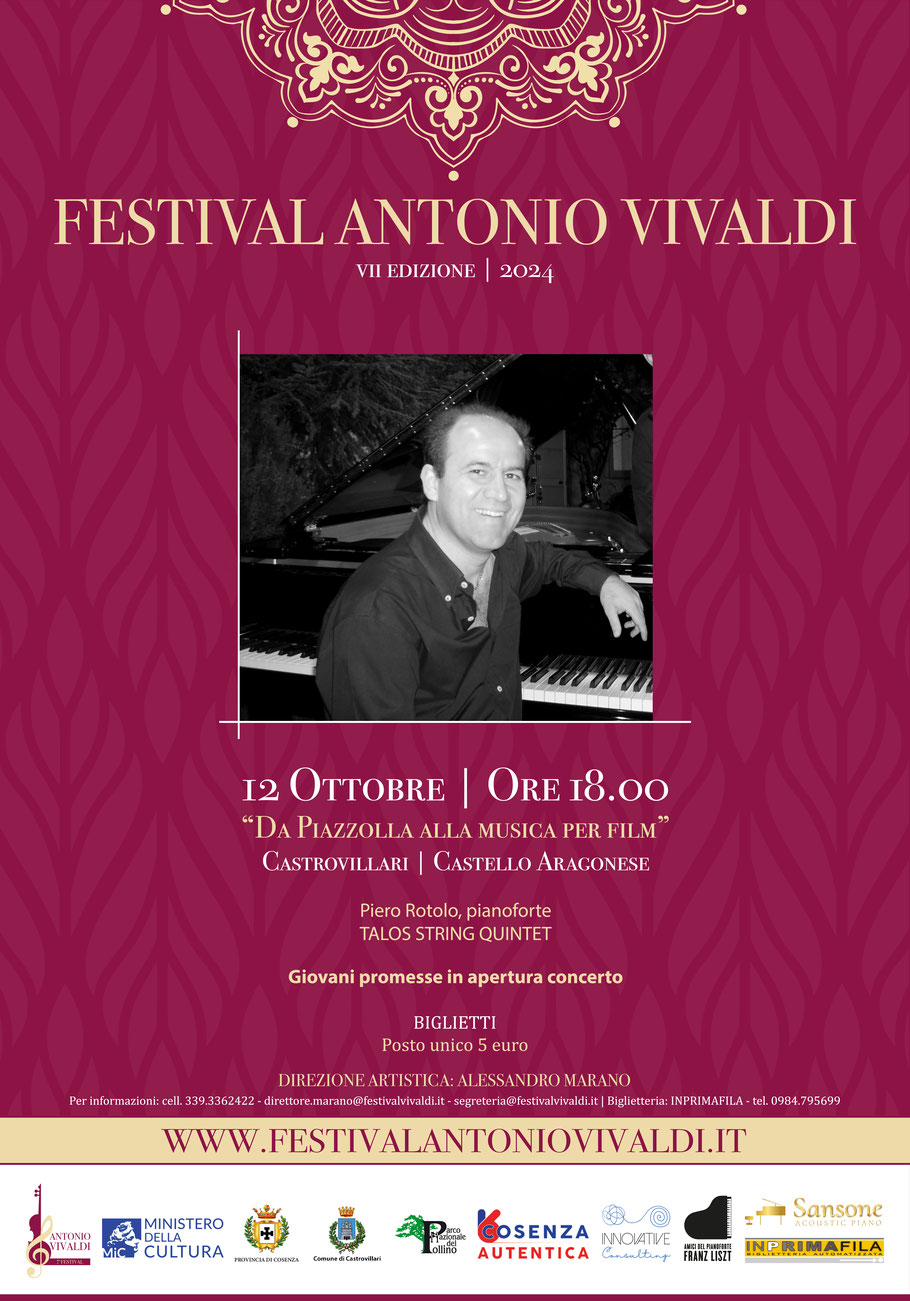Piero Rotolo pianista nato a Mola di Bari, svolge attività concertistica, didattica e organizzativa in campo musicale. Avviato agli studi musicali dal m° Nicola Diomede, si è diplomato in Pianoforte a pieni voti presso il Conservatorio di Musica “Piccinni” di Bari sotto la guida dei maestri Giuseppe Campagnola e Benedetto Lupo. Successivamente ha frequentato i Corsi di Alto Perfezionamento Pianistico tenuti da Franco Medori, Pierluigi Camicia, Adam Wibronsky, Francoise Thiollier, John Perry, Michael Staudt, Bruno Canino (per la musica da camera). Ha studiato inoltre Composizione con Raffaele Gervasio e Analisi Musicale con approfondimenti musicologici con Lorenzo Fico. Vincitore in oltre 20 Concorsi di Esecuzione Pianistica e di Musica da Camera Nazionali ed Internazionali (Albenga, Napoli, Roma, Capri, Caltanissetta, Castellaneta, Taranto, Lamezia, ecc...), ha intrapreso un’attività concertistica che lo porta ad esibirsi per importanti Istituzioni e Associazioni Musicali in Italia, Spagna, Polonia, Francia, Bulgaria, Moldova, Romania e U.S.A. (“Steinway Hall” di New York, Fondazione “Segovia” di Linares-Spagna, “Williamson Theatre” dello Staten Island College di New York, Filarmonica Statale di Shoumen-Bulgaria, Filarmonica della Radiotelevisione a Kisney-Moldova, Università di Salerno e Università per Stranieri di Perugia, Teatro Alfieri di Torino, Teatri Civici di Tortona, Marsala, Civitanova, ecc..) da solista, in varie formazioni cameristiche e come accompagnatore di cantanti, riscuotendo vivi apprezzamenti dal pubblico e dalla critica che così si è espressa :