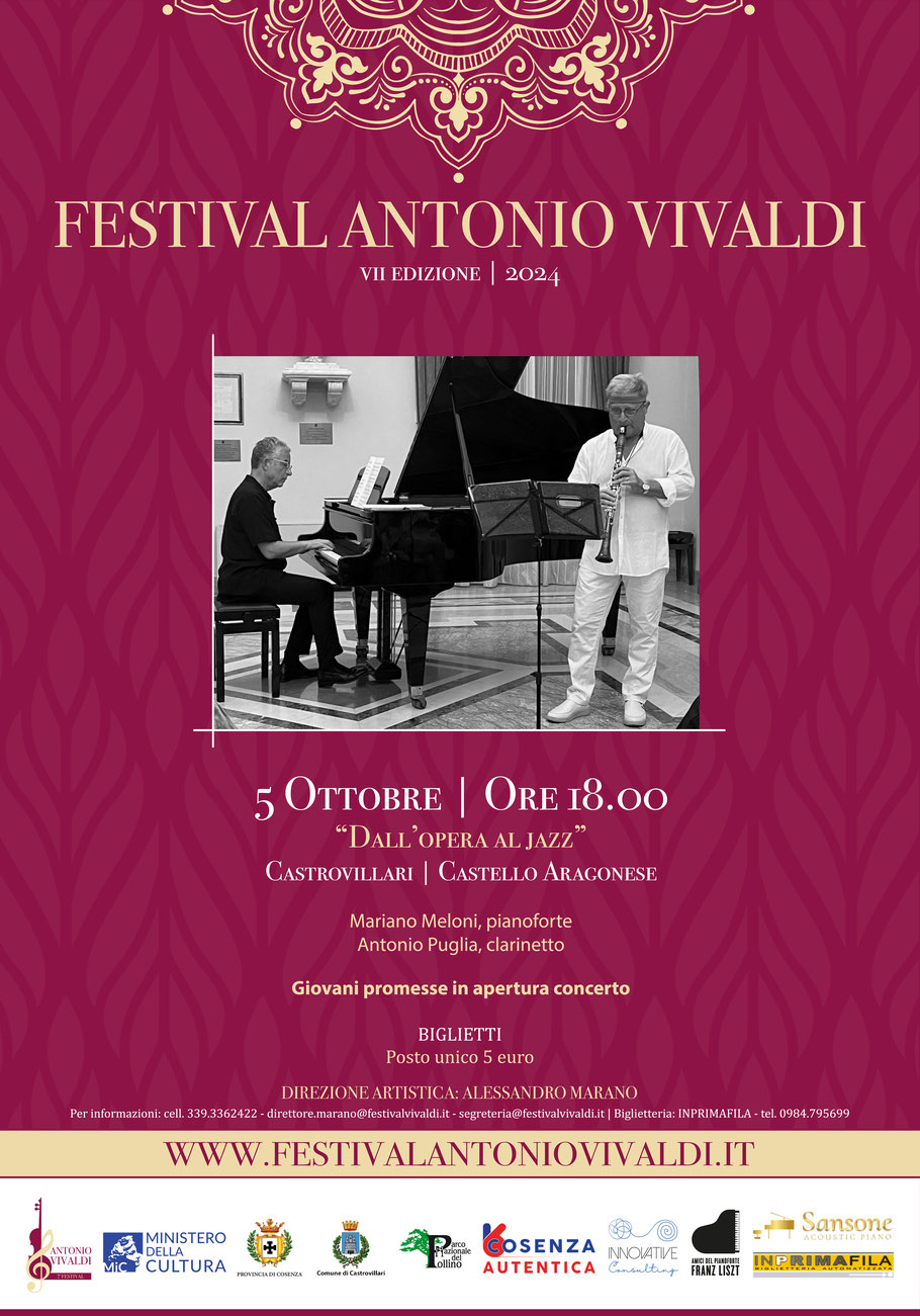 Il Duo Mistral, Antonio Puglia, clarinetto e Mariano Meloni, pianoforte fondato nel 1983 da due musicisti provenienti da prestigiose esperienze musicali. Nel corso della lunga carriera concertistica, svolta in Italia e all’Estero, questa formazione ha ottenuto larghi consensi di pubblico e di critica. Il duo, che quest’anno compie il suo 36° anno di attività, vanta un vastissimo repertorio che spazia dal 1700 fino alla Musica jazz e Contemporanea, con particolare interesse rivolto alle esecuzioni di composizioni dell’Ottocento e del Novecento.