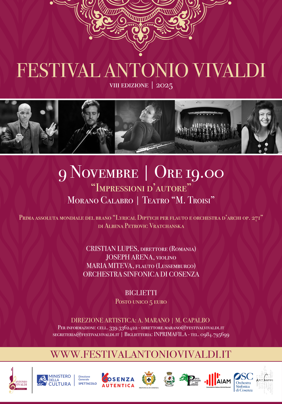 Joseph Arena è nato a Messina nel 1997, figlio d’arte, spinto dall’interesse verso il violino e la musica classica in generale, ha intrapreso lo studio del violino a 7 anni con il padre diplomandosi a soli 17 anni con il massimo dei voti e la lode presso il Conservatorio di Musica di Messina. L’interesse e la passione per la musica lo hanno portato a intraprendere studi di Composizione, conseguendo nel 2015, il IV anno (Compimento inferiore) presso il Conservatorio di Messina. Nel 2017 ha conseguito Laurea di II livello in Musica da Camera con 110 e lode presso il Conservatorio di Musica di Santa Cecilia di Roma. Ha seguito i corsi di perfezionamento con i maestri Franco Mezzena, Felice Cusano, Francesco Manara e Stefano Pagliani. Dal 2010 suona costantemente con il Trio Ars Vetus (2 violini e clavicembalo) nel repertorio barocco e con il Trio Amaj (2 violini e pianoforte) nel repertorio romantico e contemporaneo; si è già esibito, oltre che in molte città italiane, in Germania (Berlino, Heidelberg, Bad Wimpfen), Spagna (Albacete), Svezia (Stoccolma) e Francia (Parigi). Inoltre suona in Duo (violino e pianoforte) con la madre e con varie formazioni orchestrali quali l’Ensemble Barocco di Messina e l’Orchestra da Camera di Messina. Dal 2014 al 2016 è stato spalla dell’Orchestra Nazionale dei Conservatori Italiani con cui ha partecipato a tournée italiane ed estere dirette dal M° Grazioli, tra cui quella in Serbia del 2015. Collabora regolarmente con l’Orchestra del Teatro Vitt. Emanuele di Messina, saltuariamente con La Nuova Orchestra Scarlatti di Salerno e l’orchestra del Teatro “Cilea” di Reggio Calabria. Abitualmente incaricato come spalla presso il Luglio Musicale Trapanese. Nel 2023 ha vinto il primo premio assoluto di categoria e il Premio “Benedetto Albanese” dell’omonimo Concorso Musicale di Caccamo (PA). Attualmente detiene la cattedra di Violino al Liceo Musicale “Allmayer” di Alcamo (TP).